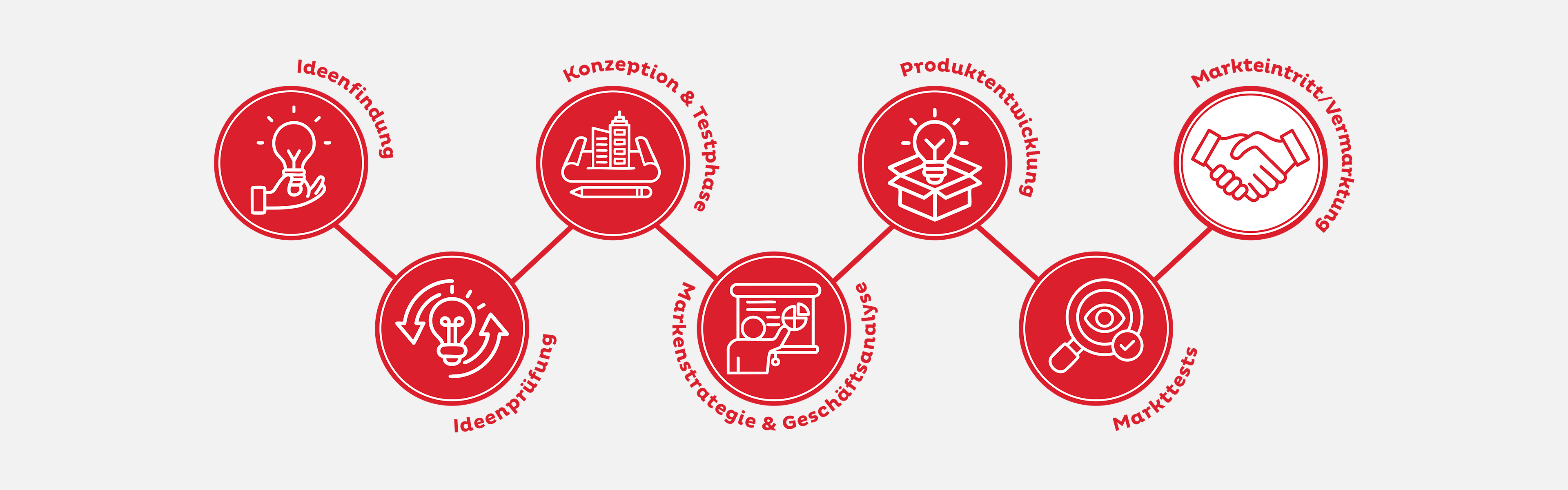 Vom ersten Brainstorming über die Konzeptentwicklung und Marktanalyse bis hin zu Produktentwicklung, Markttests und schließlich Markteinführung stehen wir Ihnen beratend und operativ zur Seite. Das folgende Bild zeigt unseren Fahrplan und macht deutlich, wie wir gemeinsam Ihre Produktideen realisieren: