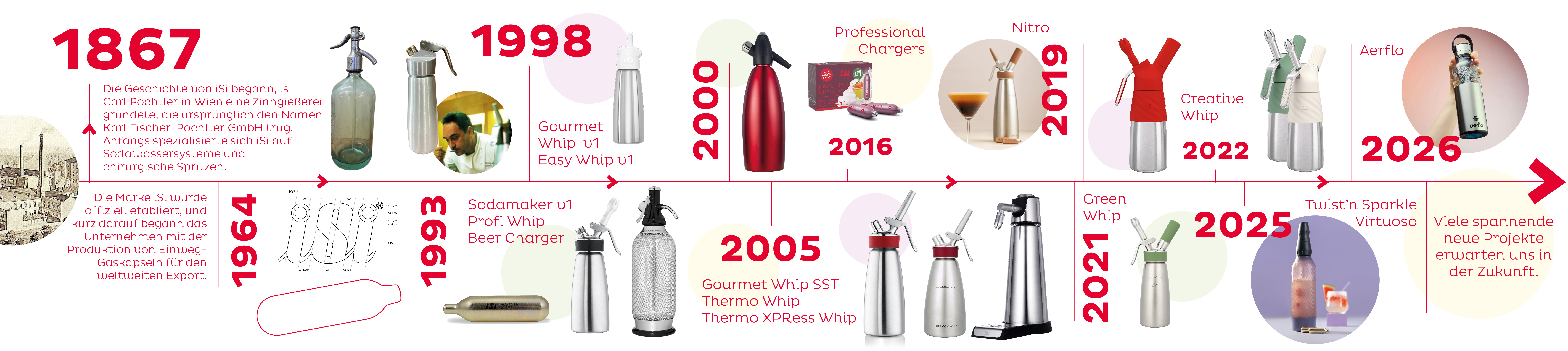 Unsere Whipper-Serien – Gourmet Whip, Green Whip und Creative Whip – markieren wichtige Meilensteine auf diesem Weg. Sie ermöglichen eine außergewöhnliche Vielfalt an Anwendungen, von klassischer Schlagsahne über frische, kalte und fruchtige Schäume bis hin zu Espumas und vielen weiteren Kreationen – den Möglichkeiten sind keine Grenzen gesetzt. Ebenso haben unsere Soda und Nitro Systeme die Welt der Getränkezubereitung entscheidend geprägt: vom Sodamaker Classic und Soda Siphon über den Twist’n Sparkle Virtuoso bis hin zum iSi Nitro für aufregende Drinks. Jede Weiterentwicklung steigert die Effizienz unserer Zylinder und Kapseln und zeigt, wie technologische Präzision und kreative Ideen Hand in Hand gehen. Werfen Sie einen Blick auf unsere bisherigen Meilensteine: